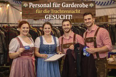 Unser Garderoben-Team ist die erste und letzte Anlaufstelle des Abends – und damit echte Visitenkarte der Trachtennacht. Mit einem freundlichen Lächeln nehmen sie Jacken, Mäntel und Taschen entgegen, sorgen für eine sichere und strukturierte Aufbewahrung und behalten auch bei großem Andrang den Überblick.