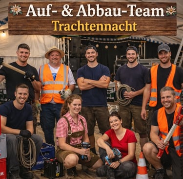 Unser Auf- & Abbau-Team bildet das Fundament der Trachtennacht – lange bevor der erste Gast das Festzelt betritt und noch dann, wenn die Lichter bereits wieder ausgehen. Mit Tatkraft, Organisationstalent und einem guten Blick fürs Detail sorgen sie dafür, dass Bühne, Technik, Bestuhlung und Dekoration professionell vorbereitet und sicher aufgebaut sind.